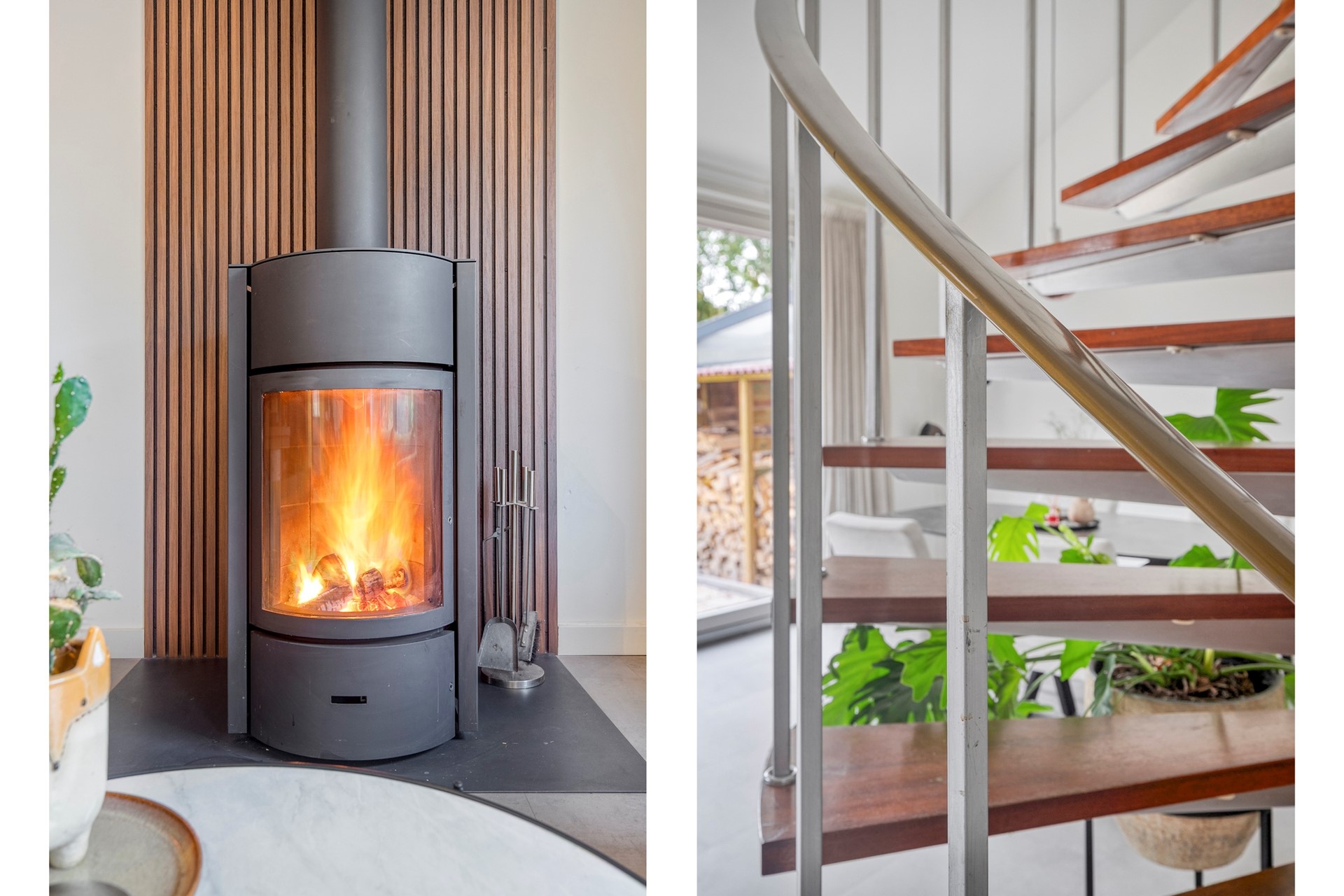 Zodra je binnenkomt, ervaar je direct de hoogte en het licht. De gehele begane grond is in 2022 vernieuwd met een PVC-vloer met vloerverwarming. De woonkamer is strak, rustig en sfeervol dankzij de moderne houtkachel (2023) en een stijlvolle houten lattenwand. Grote raampartijen (7,85 m breed) en een schuifpui brengen buiten naar binnen.