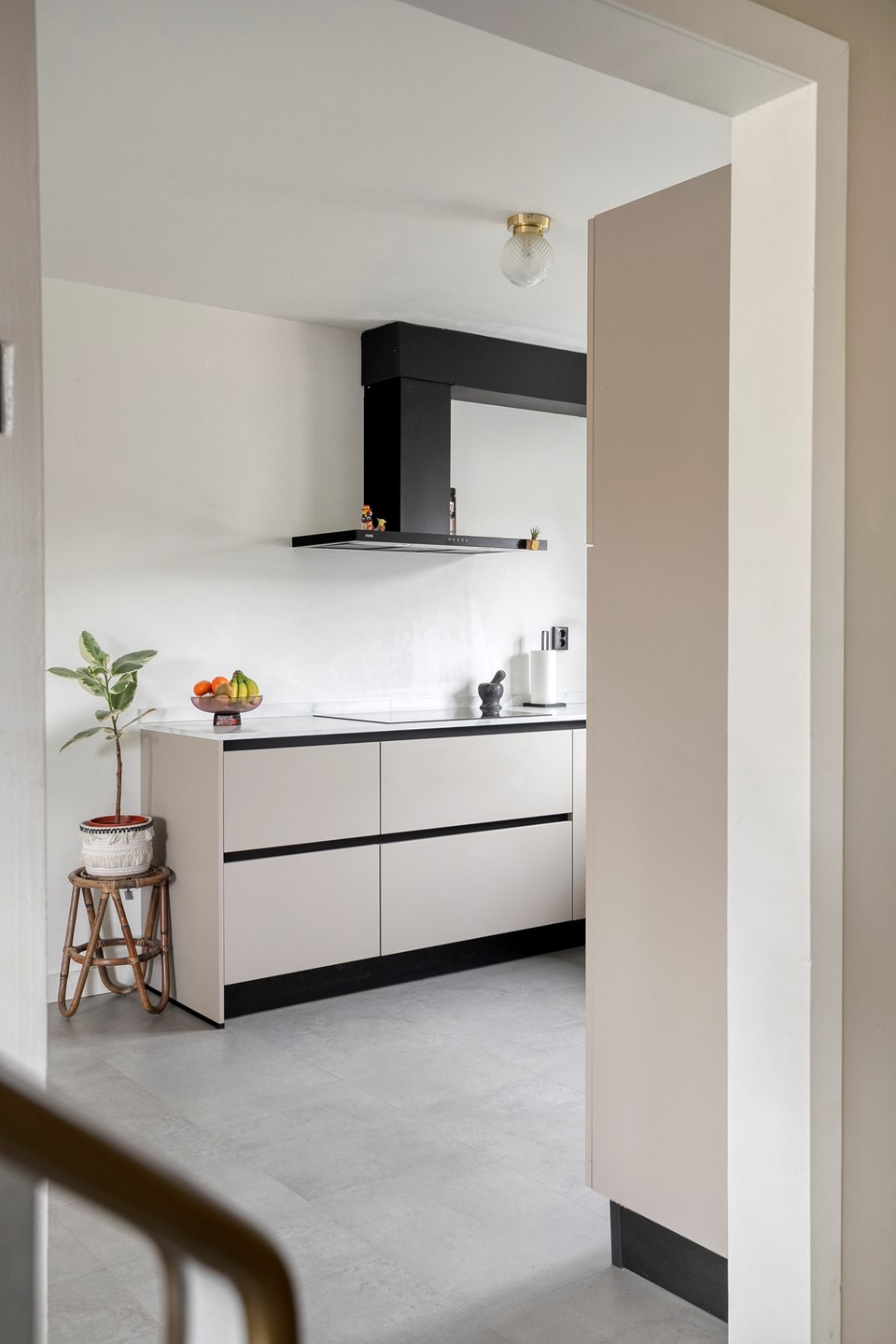 De designkeuken (2022) is een statement: voorzien van een hoge kastenwand, oven en goudkleurige accenten die warmte en luxe uitstralen.