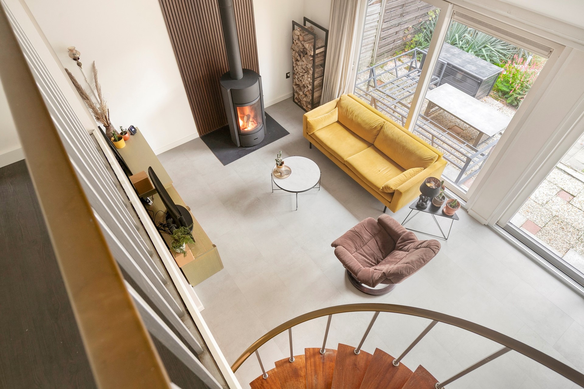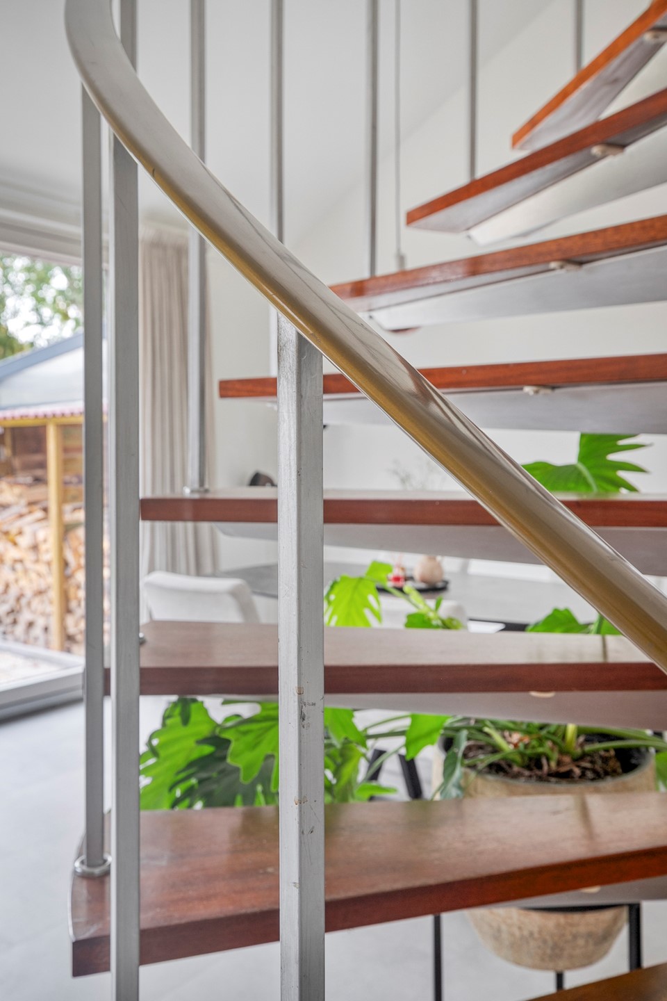 Via de spiltrap bereik je de vide met uitzicht op de living.
